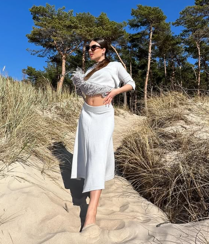 Sudėtis: 70 % viskozė, 30 % medvilnė. Dekoruota prancūziškais nėriniais, plunksnomis ir Swarovski perlais.