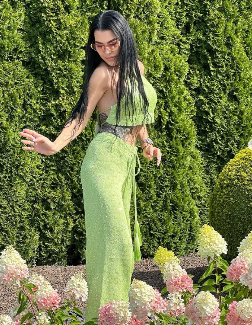 Produkto aprašymas: dviejų dalių kostiumėlis – palaidinė ir kelnės. Sudėtis – medvilnė 70 %, viskozė 30 %.